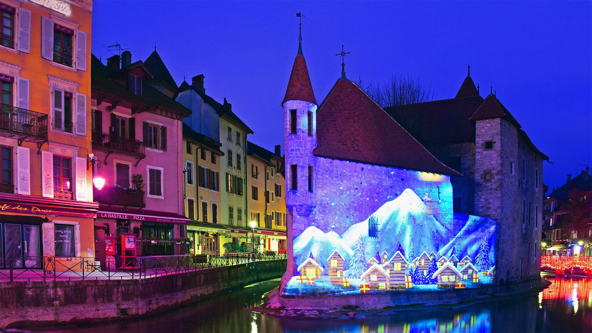 Winter scene illuminated on the Palais de l'Isle in Annecy