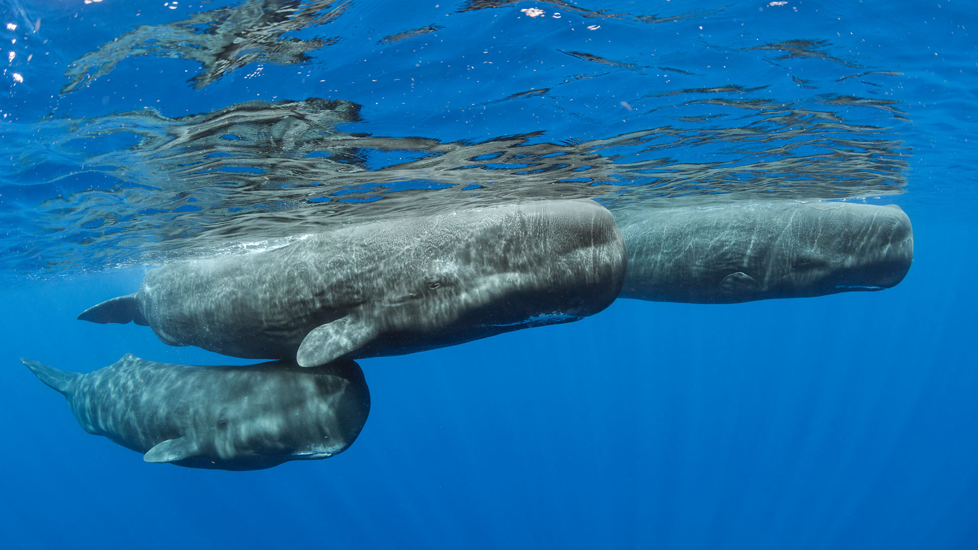 Sperm whale pod surfacing, Dominica (© Franco Banfi/Minden Pictures)